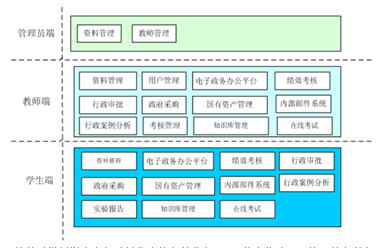 本(ben)教(jiao)學(xue)平臺(tai)軟件以模擬學(xue)生在行政(zheng)單位中(zhong)的(de)(de)(de)(de)各種業(ye)(ye)務(wu)(wu),運用信息(xi)化建(jian)設環境下(xia)的(de)(de)(de)(de)各種角色、功(gong)能(neng)配(pei)置,以各業(ye)(ye)務(wu)(wu)關系(xi)和流(liu)程作為主要(yao)實踐(jian)教(jiao)學(xue)的(de)(de)(de)(de)手段(duan),配(pei)以教(jiao)師強大的(de)(de)(de)(de)后臺(tai)管理(li)功(gong)能(neng)和教(jiao)學(xue)工具,滿足電子政(zheng)務(wu)(wu)及相關學(xue)科的(de)(de)(de)(de)教(jiao)師運用現代化教(jiao)學(xue)工具開展(zhan)網絡教(jiao)學(xue)和實踐(jian)教(jiao)學(xue)的(de)(de)(de)(de)要(yao)求。