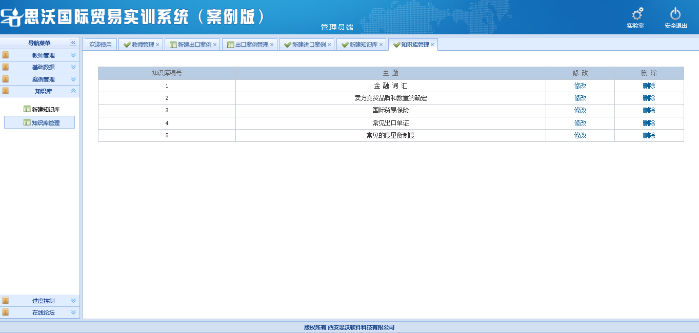 9.提供知識(shi)(shi)庫(ku),即“背(bei)景知識(shi)(shi)”,是由管(guan)(guan)理(li)員(yuan)在(zai)管(guan)(guan)理(li)平臺的(de)“管(guan)(guan)理(li)員(yuan)管(guan)(guan)理(li)”下的(de)“知識(shi)(shi)庫(ku)管(guan)(guan)理(li)”中(zhong)進(jin)行知識(shi)(shi)庫(ku)內容的(de)添加和管(guan)(guan)理(li)。如果(guo)要(yao)查看(kan)知識(shi)(shi)庫(ku)內容,可不需要(yao)登陸。在(zai)系統(tong)首(shou)頁,點擊“出(chu)口流程”、“進(jin)口流程”或“咨詢(xun)信(xin)息”、“教(jiao)師入口”等,都可打開(kai)知識(shi)(shi)庫(ku)的(de)鏈節頁面。