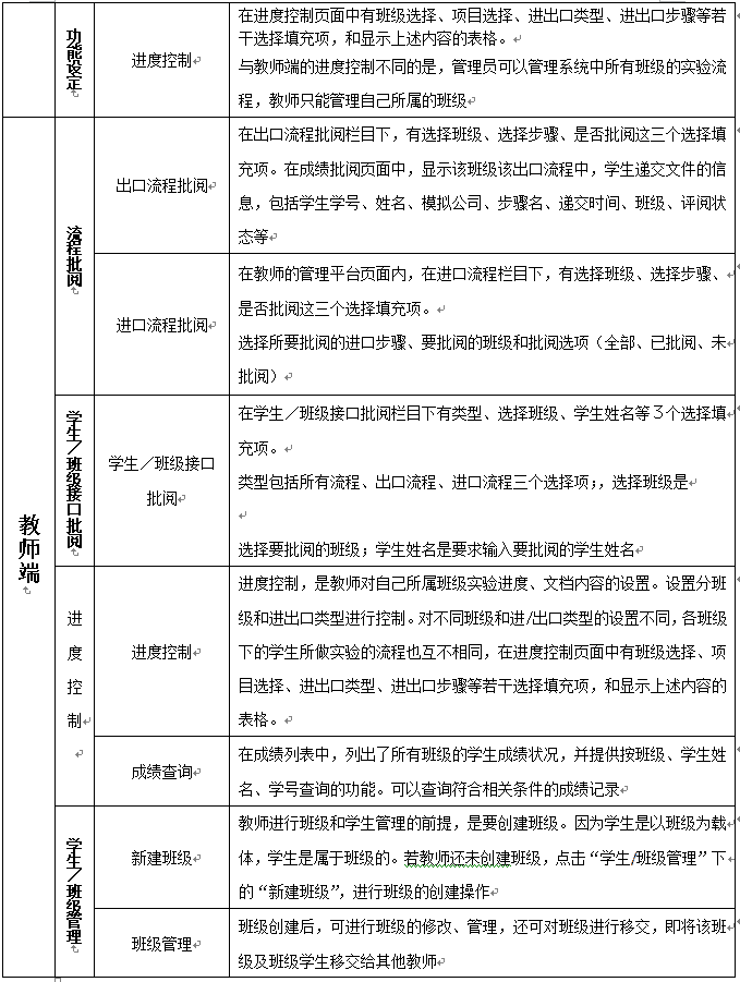 2.權限(xian)分為管(guan)理(li)員(yuan)、教(jiao)(jiao)師(shi)和學生(sheng),其(qi)中學生(sheng)端(duan)在首頁(ye)以出(chu)口(kou)流程、進口(kou)流程、資費信(xin)息、幫助、注冊(ce)等(deng)模塊顯示。教(jiao)(jiao)師(shi)通過兩個權限(xian)對用(yong)戶、實驗(yan)(yan)基礎數據(ju)、實驗(yan)(yan)進程等(deng)方(fang)面(mian)進行(xing)有(you)效的(de)管(guan)理(li)。教(jiao)(jiao)師(shi)通過系統中的(de)獨立端(duan)口(kou)對班級(ji)學生(sheng)進行(xing)管(guan)理(li),可(ke)對學生(sheng)所(suo)需實驗(yan)(yan)步驟進行(xing)分步開放操作權限(xian)。教(jiao)(jiao)師(shi)也可(ke)根據(ju)自己所(suo)總結的(de)案例(li)或者典型的(de)案例(li)在管(guan)理(li)員(yuan)端(duan)口(kou)進行(xing)添(tian)加,操作簡(jian)單、方(fang)便。