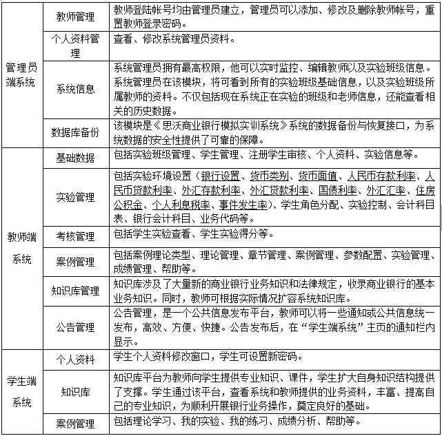 系統設(she)計開發(fa)模仿銀(yin)(yin)(yin)行(xing)(xing)(xing)組織(zhi)結構(gou):總(zong)行(xing)(xing)(xing)由若(ruo)干分行(xing)(xing)(xing)構(gou)成,分行(xing)(xing)(xing)由若(ruo)干支(zhi)行(xing)(xing)(xing)組成。由教師建立一(yi)個(ge)模擬的(de)(de)商(shang)業(ye)(ye)(ye)(ye)(ye)(ye)(ye)(ye)銀(yin)(yin)(yin)行(xing)(xing)(xing)實驗(yan)(yan)項(xiang)(xiang)目(mu),并(bing)為該實驗(yan)(yan)項(xiang)(xiang)目(mu)配置實驗(yan)(yan)環境,設(she)置實驗(yan)(yan)參數,統一(yi)控制實驗(yan)(yan)進(jin)程。學(xue)生(sheng)在教師搭建的(de)(de)商(shang)業(ye)(ye)(ye)(ye)(ye)(ye)(ye)(ye)銀(yin)(yin)(yin)行(xing)(xing)(xing)實驗(yan)(yan)環境中,通過(guo)扮演綜合角色、柜(ju)(ju)員(yuan)角色來開展各項(xiang)(xiang)個(ge)人(ren)業(ye)(ye)(ye)(ye)(ye)(ye)(ye)(ye)務(wu)(wu)(wu)(存款業(ye)(ye)(ye)(ye)(ye)(ye)(ye)(ye)務(wu)(wu)(wu)、銀(yin)(yin)(yin)行(xing)(xing)(xing)卡業(ye)(ye)(ye)(ye)(ye)(ye)(ye)(ye)務(wu)(wu)(wu)、貸(dai)款業(ye)(ye)(ye)(ye)(ye)(ye)(ye)(ye)務(wu)(wu)(wu)、匯款業(ye)(ye)(ye)(ye)(ye)(ye)(ye)(ye)務(wu)(wu)(wu)、外匯業(ye)(ye)(ye)(ye)(ye)(ye)(ye)(ye)務(wu)(wu)(wu)、代理(li)業(ye)(ye)(ye)(ye)(ye)(ye)(ye)(ye)務(wu)(wu)(wu))、對(dui)公業(ye)(ye)(ye)(ye)(ye)(ye)(ye)(ye)務(wu)(wu)(wu)(存款業(ye)(ye)(ye)(ye)(ye)(ye)(ye)(ye)務(wu)(wu)(wu)、貸(dai)款業(ye)(ye)(ye)(ye)(ye)(ye)(ye)(ye)務(wu)(wu)(wu)、人(ren)民幣(bi)支(zhi)付結算服(fu)務(wu)(wu)(wu)業(ye)(ye)(ye)(ye)(ye)(ye)(ye)(ye)務(wu)(wu)(wu))。在學(xue)生(sheng)開始實驗(yan)(yan)操作(zuo)(zuo)(zuo)之前(qian),首先(xian)由扮演綜合角色的(de)(de)學(xue)生(sheng)進(jin)行(xing)(xing)(xing)實驗(yan)(yan)準備工作(zuo)(zuo)(zuo),然后由扮演柜(ju)(ju)員(yuan)角色的(de)(de)學(xue)生(sheng),添加個(ge)人(ren)客戶(hu)(hu)或(huo)企(qi)業(ye)(ye)(ye)(ye)(ye)(ye)(ye)(ye)客戶(hu)(hu),并(bing)向銀(yin)(yin)(yin)行(xing)(xing)(xing)提交(jiao)相關的(de)(de)個(ge)人(ren)業(ye)(ye)(ye)(ye)(ye)(ye)(ye)(ye)務(wu)(wu)(wu)或(huo)對(dui)公業(ye)(ye)(ye)(ye)(ye)(ye)(ye)(ye)務(wu)(wu)(wu)辦理(li)申請(qing),由一(yi)般柜(ju)(ju)員(yuan)或(huo)綜合柜(ju)(ju)員(yuan)相互協作(zuo)(zuo)(zuo)受(shou)理(li)各項(xiang)(xiang)業(ye)(ye)(ye)(ye)(ye)(ye)(ye)(ye)務(wu)(wu)(wu)。通過(guo)軟件操作(zuo)(zuo)(zuo),不僅深化學(xue)生(sheng)對(dui)銀(yin)(yin)(yin)行(xing)(xing)(xing)金(jin)融理(li)論的(de)(de)理(li)解,而且(qie)加快掌握銀(yin)(yin)(yin)行(xing)(xing)(xing)系統操作(zuo)(zuo)(zuo)技能,讓(rang)學(xue)生(sheng)體(ti)驗(yan)(yan)真(zhen)正的(de)(de)商(shang)業(ye)(ye)(ye)(ye)(ye)(ye)(ye)(ye)銀(yin)(yin)(yin)行(xing)(xing)(xing)業(ye)(ye)(ye)(ye)(ye)(ye)(ye)(ye)務(wu)(wu)(wu)流程。