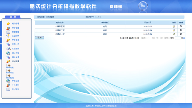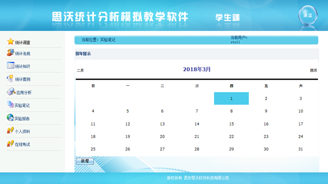 【學生端功能(neng)】:統(tong)計調(diao)查(cha)、統(tong)計法規(gui)、統(tong)計知識、統(tong)計案例、應用分析、實(shi)驗筆記、實(shi)驗報告、個(ge)人(ren)資料、在線考試(shi)、幫助、退出系統(tong)。