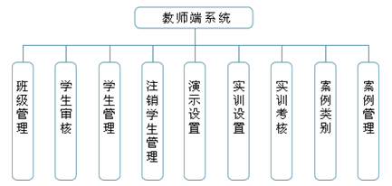 教師端(duan)系統由班級管(guan)理、學生審核、學生管(guan)理、注(zhu)銷學生管(guan)理、演示(shi)設(she)置(zhi)(zhi)、實(shi)訓設(she)置(zhi)(zhi)、實(shi)訓考核、案(an)例(li)類別、案(an)例(li)管(guan)理組(zu)成。