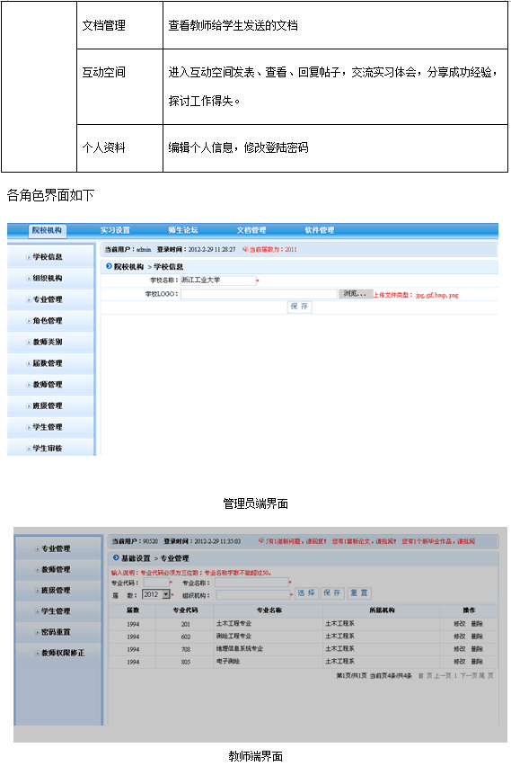 軟件(jian)按管理員(yuan)、教師(shi)、學(xue)(xue)生分(fen)為三種用(yong)戶權(quan)限。其中,管理員(yuan)設(she)(she)(she)置軟件(jian)基礎信(xin)息,包(bao)括(kuo):學(xue)(xue)校(xiao)信(xin)息、院校(xiao)組(zu)織機構、屆(jie)數年份管理、教師(shi)類別、權(quan)限管理等。教師(shi)根據權(quan)限不(bu)同(tong),功能模(mo)塊(kuai)不(bu)同(tong),只有開通了(le)權(quan)限的教師(shi)可(ke)(ke)操作(zuo)(zuo)相應的功能。教師(shi)角色(se)的主(zhu)要模(mo)塊(kuai)包(bao)括(kuo):系(xi)統設(she)(she)(she)置、統計查看(kan)、畢業(ye)實(shi)(shi)習、畢業(ye)設(she)(she)(she)計、成(cheng)(cheng)績管理、輔(fu)(fu)助工具。學(xue)(xue)生在實(shi)(shi)習期間(jian),應按時填寫周(zhou)記,完成(cheng)(cheng)教師(shi)的作(zuo)(zuo)業(ye),在有疑問(wen)時還可(ke)(ke)以向教師(shi)提問(wen)。學(xue)(xue)生端(duan)的主(zhu)要模(mo)塊(kuai)有:畢業(ye)實(shi)(shi)習匯總、畢業(ye)實(shi)(shi)習、畢業(ye)設(she)(she)(she)計、成(cheng)(cheng)績查看(kan)、輔(fu)(fu)助工具